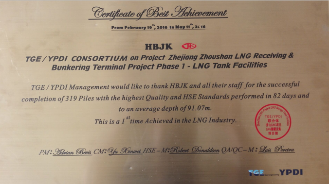 近日我公司收到TGE/YPDI的浙江舟山LNG儲罐接收站項目“最佳成績證書”牌匾,內(nèi)容:TGE/YPDI 管理層對2016年2月19日至2016年5月11日期間河北建勘及其員工以高質(zhì)量和嚴格的HSE管理標(biāo)準在82天內(nèi)完成319根樁基且平均深度在91.07米的成績表示感謝。