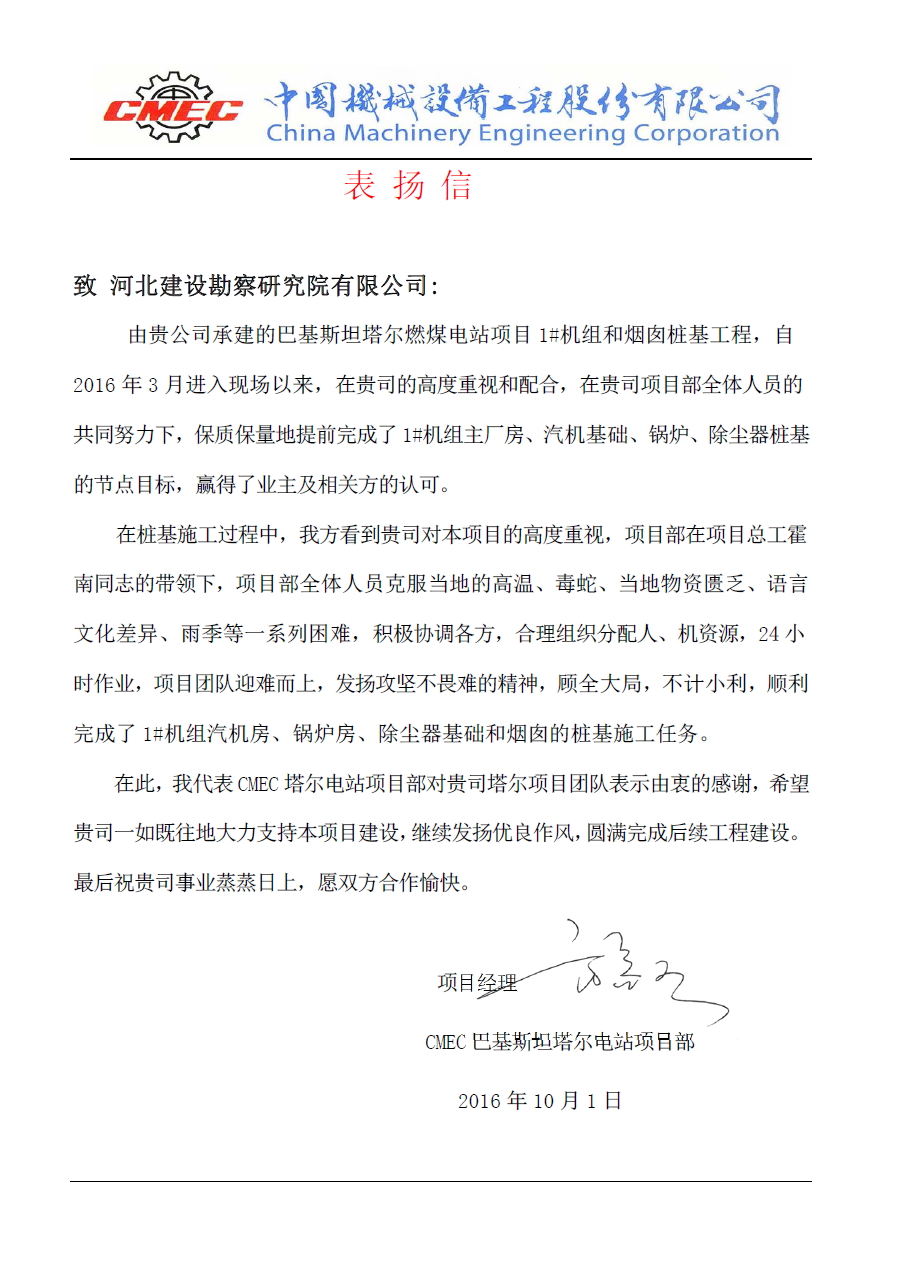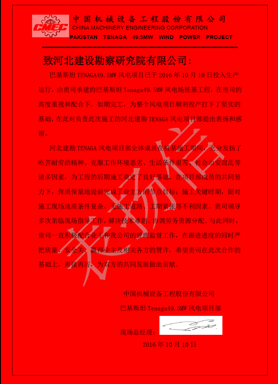 由我公司承建的巴基斯坦塔爾燃煤電站項目1#機(jī)組和煙囪樁基工程和巴基斯坦Tenaga49.5MW風(fēng)電項目,項目部全體人員在項目總工霍南的帶領(lǐng)下,克服工作環(huán)境惡劣、生活條件艱苦等一系列困難,積極協(xié)調(diào)各方,合理組織分配資源,順利完成階段施工任務(wù)。近日,總包方中國機(jī)械設(shè)備工程股份有限公司(CMEC)向我公司發(fā)來感謝信,對我公司兩個項目部團(tuán)隊表示由衷的感謝,并希望我們繼續(xù)發(fā)揚(yáng)優(yōu)良作風(fēng),圓滿完成后續(xù)工程建設(shè)。