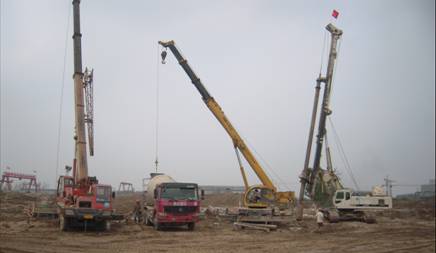 本工程樁基采用后壓漿旋挖鉆孔灌注樁,完成了高效沉降槽、種子過濾、1#、2#、3#、4#焙燒爐、電除塵、平盤過濾、預(yù)脫硅槽、高位槽、種子分解、1#、2#、3#、4#冷卻塔、1#、2#、3#鋁粉倉、棧橋、堿液調(diào)配、提升機(jī)、礦漿槽和蒸發(fā)器、礦漿槽、蒸發(fā)器、冷卻塔、堿液調(diào)配、預(yù)脫硅槽、高位槽。施工主要內(nèi)容包括:測量放線、鋼筋籠制作、運(yùn)輸與吊裝、成孔、混凝土攪拌與運(yùn)輸、水下混凝土灌注、后壓漿、渣土清運(yùn)等。共完成直徑1000mm、800mm和600mm的灌注樁共4501根,樁身混凝土為C25和C30兩種,混凝土設(shè)計(jì)方量81773.8m3,實(shí)際灌注方量95288.0m3,平均充盈系數(shù)1.17。