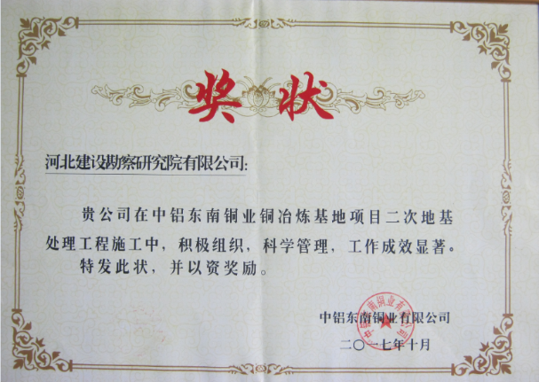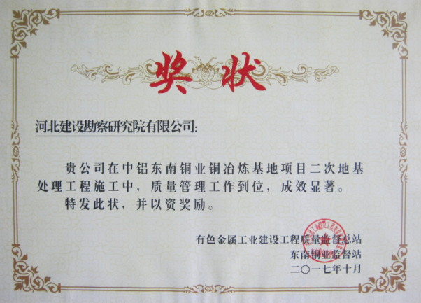 公司承接的福建省寧德市中鋁東南銅業(yè)銅冶煉基地項目二次地基處理工程,施工中嚴(yán)格執(zhí)行公司規(guī)章制度及綜合管理體系標(biāo)準(zhǔn),精心策劃,嚴(yán)格控制,科學(xué)管理。在現(xiàn)場10多家施工單位各項檢查評比中,得到了業(yè)主中鋁東南銅業(yè)有限公司的表揚,對現(xiàn)場安全、質(zhì)量、進(jìn)度管理給予了高度評價,分別授予“項目管理突出”獎和“質(zhì)量管理”獎。