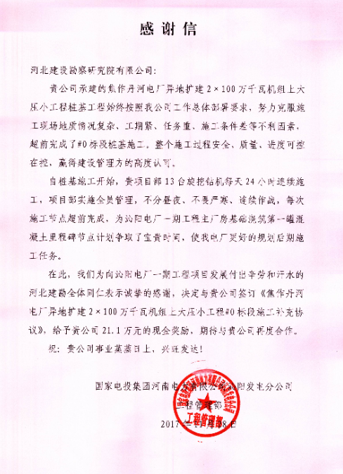 我公司承建的焦作丹河電廠異地擴(kuò)建2×100萬千瓦機(jī)組上大壓小工程樁基工程,始終按照業(yè)主工作總體部署要求,努力克服施工現(xiàn)場地質(zhì)情況復(fù)雜、工期緊、任務(wù)重、施工條件差等不利因素,超前完成了#0標(biāo)段樁基施工,整個施工過程安全、質(zhì)量、進(jìn)度可控在控,贏得了建設(shè)管理方的高度認(rèn)可。11月28日,國家電投集團(tuán)河南電力有限公司沁陽發(fā)電分公司工程管理部發(fā)來感謝信,對我公司項目部員工表示感謝,并期待與我公司的再度合作。