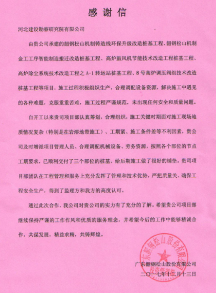 由我公司施工的韶鋼煤氣高效綜合循環(huán)利用改建工程,克服了施工過程中的各項難題,已順利交付三個部位樁基,得到了廣東韶鋼松山股份有限公司的高度認(rèn)可,特向公司發(fā)來感謝信。