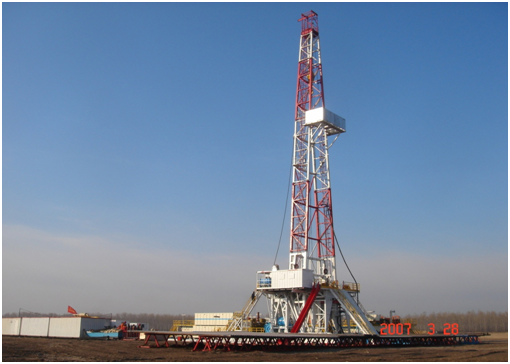 該型頁巖氣鉆機,包括底座、井架、動力裝置、傳動機構、聯(lián)動機構、轉盤、絞車、游車、高壓管路、泥漿泵以及氣控系統(tǒng)。其優(yōu)點在于:通過采用密閉水冷式絞車,滾筒摩擦轂冷卻采用離心泵強制循環(huán)水冷卻方式,主滾筒摩擦轂上帶有水套和水循環(huán)管線;動力裝置采用三臺柴油發(fā)動機,同時三臺柴油發(fā)動機之間設置聯(lián)動機構,增大功率;配備兩臺3NB 1300C泥漿泵,能滿足噴射鉆井的需要。