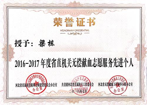 梁棟同志被授予2016-2017年度省直機關無償獻血志愿服務先進個人