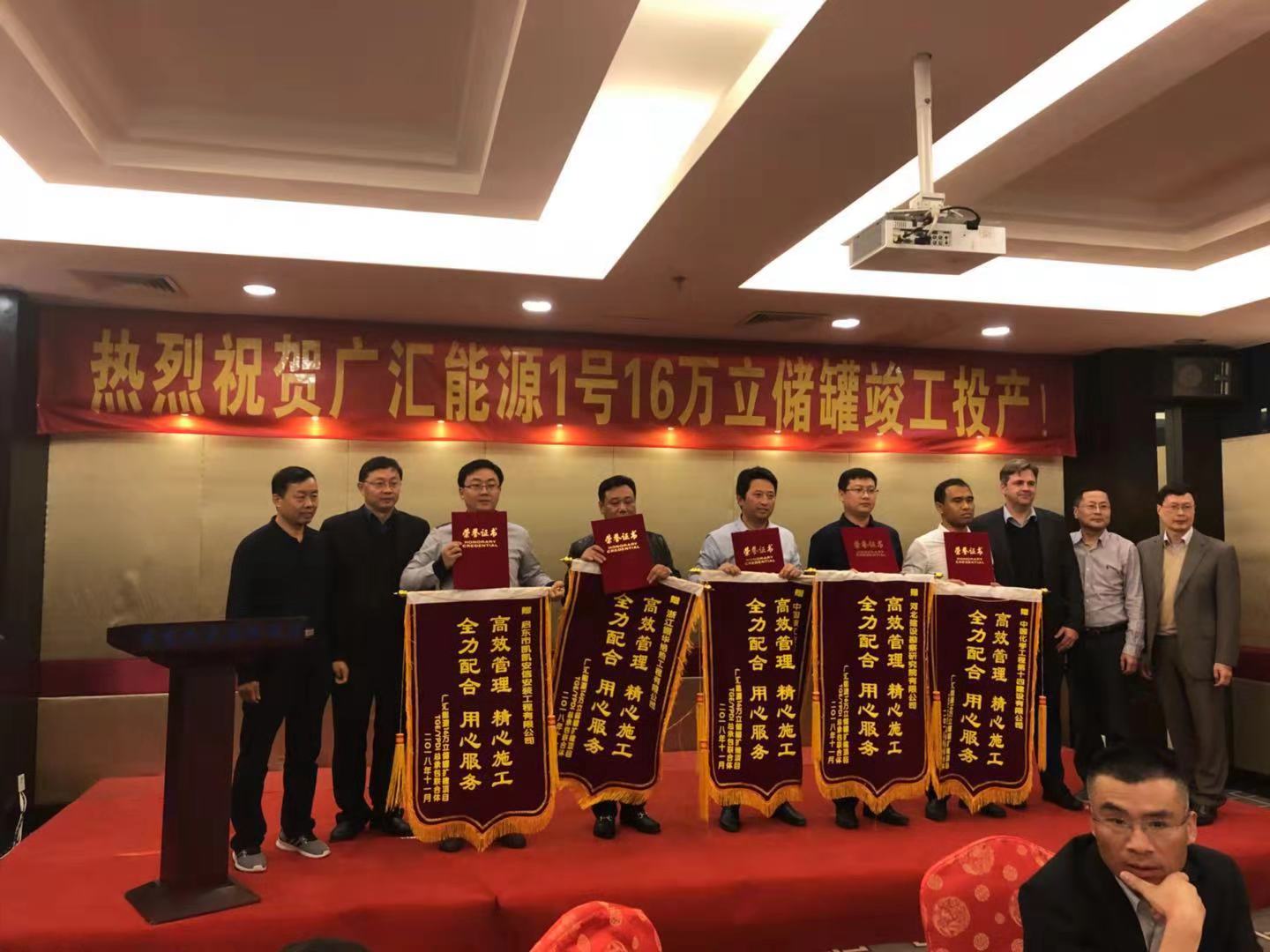 2018年11月21日,廣匯能源1號16萬m³儲罐項目順利投產(chǎn),并創(chuàng)造了LNG行業(yè)新的記錄。在竣工投產(chǎn)慶功會上,廣匯能源總經(jīng)理和TGE總經(jīng)理對我公司在項目中的突出貢獻給予了高度贊揚,并授予錦旗和“優(yōu)秀分包商”證書,同時也對我公司在2號16萬立方儲罐施工過程中的優(yōu)秀表現(xiàn)提出了表揚,并期望我公司更多的參與廣匯能源的項目建設(shè)。