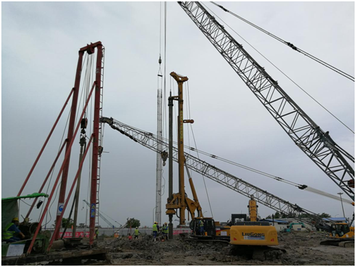 該項目于2018年3月10日開工,2018年9月2日竣工,共計完成直徑600mm鉆孔灌注樁1250根,樁長為30.15m,混凝土方量10650m³,高峰期時投入旋挖鉆機3臺套,回轉(zhuǎn)鉆機5臺套。