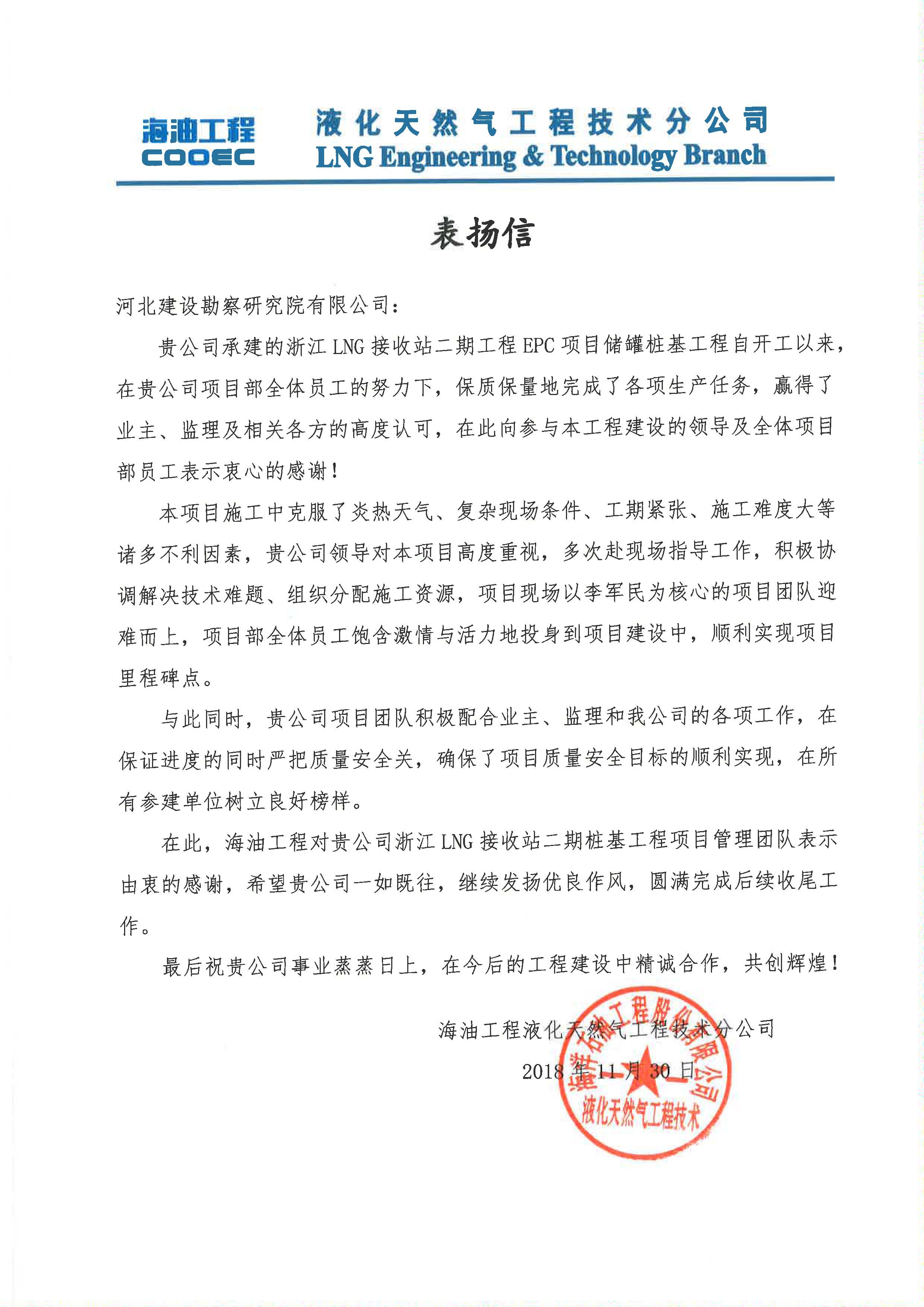 近日我公司浙江LNG接收站二期工程EPC項目儲罐樁基工程項目部收到業(yè)主發(fā)來表揚信。