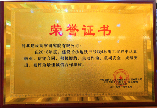 我公司承建的長(zhǎng)沙地鐵三號(hào)線4標(biāo)施工監(jiān)測(cè)項(xiàng)目,自開(kāi)工以來(lái)精心策劃、有效組織、認(rèn)真施工、積極與業(yè)主配合。施工過(guò)程中我公司認(rèn)真敬業(yè),信守合同,積極履約,主動(dòng)作為,重視安全,成績(jī)突出,中鐵建大橋工程局集團(tuán)特授予我公司 “最佳誠(chéng)信合作單位”榮譽(yù)獎(jiǎng)牌,以示表彰!