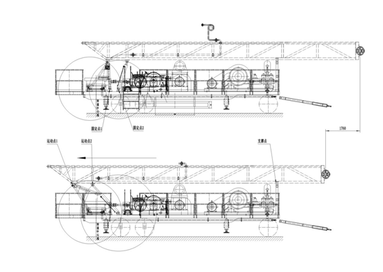 該型鉆機(jī)鉆塔通過液壓起塔油缸可整體橫向移動(dòng)1760mm,使得鉆機(jī)在移動(dòng)和運(yùn)輸狀態(tài)時(shí)布局均勻,成功解決了拖車鉆機(jī)鉆塔“前短后長(zhǎng)”的弊病。該型水井鉆機(jī)轉(zhuǎn)盤使用∅670mm通徑轉(zhuǎn)盤,轉(zhuǎn)盤輸入軸連接盤按JN162萬向軸連接尺寸加工,帶液壓活門機(jī)構(gòu),底盤兩側(cè)安裝柵格網(wǎng)底板。井口活門采用液壓驅(qū)動(dòng),在井口活門上安裝兩個(gè)開合油缸,推動(dòng)井口活門開合,有效降低了操作者的勞動(dòng)強(qiáng)度,使用方便可靠。