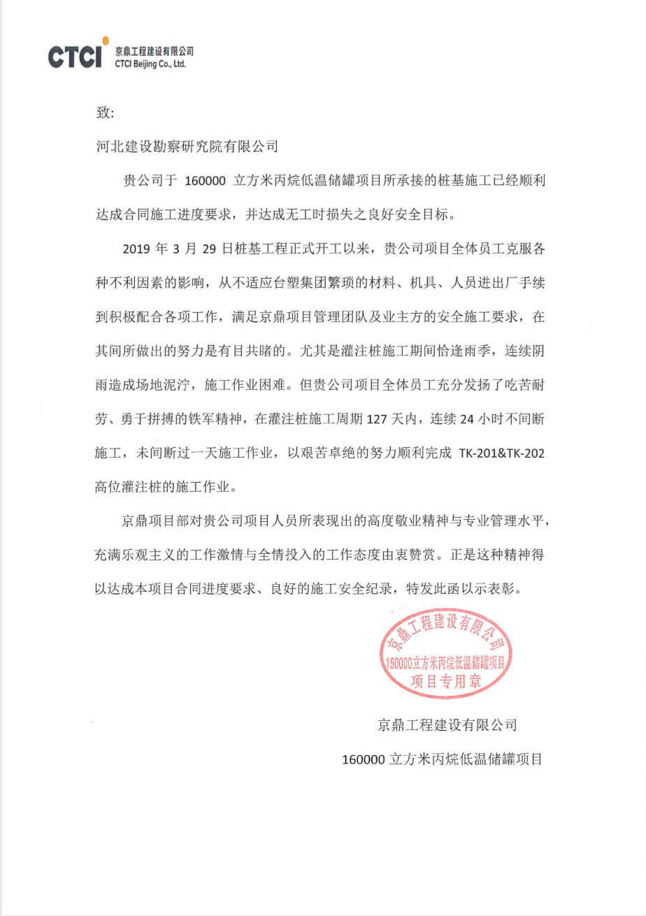 我公司承接的160000立方米丙烷低溫儲(chǔ)罐樁基施工工程,自開工以來,項(xiàng)目部全體員工克服各種不利因素的影響,經(jīng)過艱苦卓絕的不懈努力,已順利達(dá)成合同施工進(jìn)度要求,并達(dá)成無工時(shí)損失之良好安全目標(biāo),滿足京鼎項(xiàng)目團(tuán)隊(duì)及業(yè)主方的安全施工要求,已圓滿完成各項(xiàng)施工任務(wù),順利完工。期間所表現(xiàn)出的高度敬業(yè)精神和專業(yè)管理水平,得到了業(yè)主和監(jiān)理的一致好評(píng),近期特向我公司發(fā)函予以表?yè)P(yáng)。
