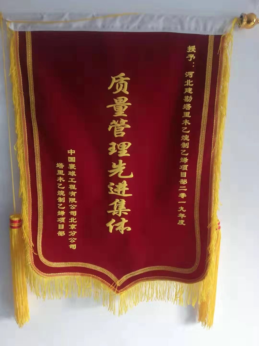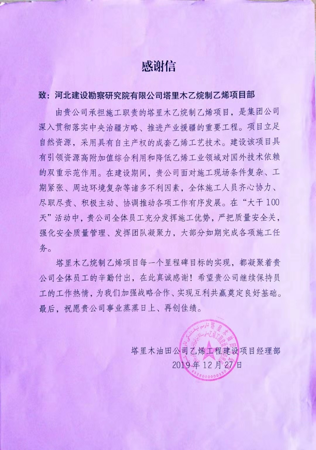 公司近日收到業(yè)主塔里木油田公司乙烯工程建設項目經(jīng)理部的感謝信及中國寰球工程有限公司北京分公司的質量管理先進集體錦旗。在建設期間,我公司面對現(xiàn)場條件復雜、工期緊張等諸多不利因素,全體施工人員齊心協(xié)力、盡職盡責、積極主動、協(xié)調推動各工作有序開展,在施工中,嚴把質量安全觀、強化安全質量管理、發(fā)揮團隊凝聚力,很好的完成了各項施工任務,為雙方進一步加強戰(zhàn)略合作、實現(xiàn)互利共贏奠定了良好基礎。