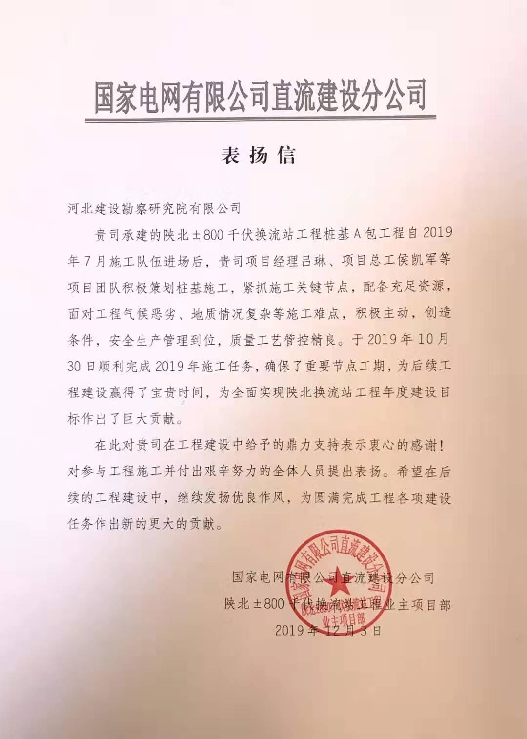 另有陜北換流站項目部也收到國家電網(wǎng)直流建設分公司的感謝信,該項目自2019年7月進場后,在項目經(jīng)理呂琳、項目總工侯凱軍等精心組織和艱苦努力下,順利完成施工任務,確保了重要節(jié)點工期,為后續(xù)工程建設贏得了寶貴時間,為全面實現(xiàn)陜北換流站工程年度建設目標作出巨大貢獻,受到業(yè)主的充分肯定和高度表揚。