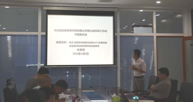 2020年6月2日下午,公司博士后工作站舉辦博士后研究人員張海清的開題報告會。由博士后工作站站長聶慶科正高級工程師、河北省建筑科學(xué)研究院副院長王維玉正高級工程師、北京交通大學(xué)白冰教授、河北科技大學(xué)張亞通教授、河北省生態(tài)環(huán)境廳謝劍鋒正高級工程師組成專家組,對張海清博士研究的《赤泥-粉煤灰地質(zhì)聚合物樁(RFP)承載性能及樁身材料宏微觀特性試驗研究》開題報告進行了評審,公司總經(jīng)理李華偉、省人力資源和社會保障廳、市人力資源和社會保障局有關(guān)領(lǐng)導(dǎo)參加了報告會。