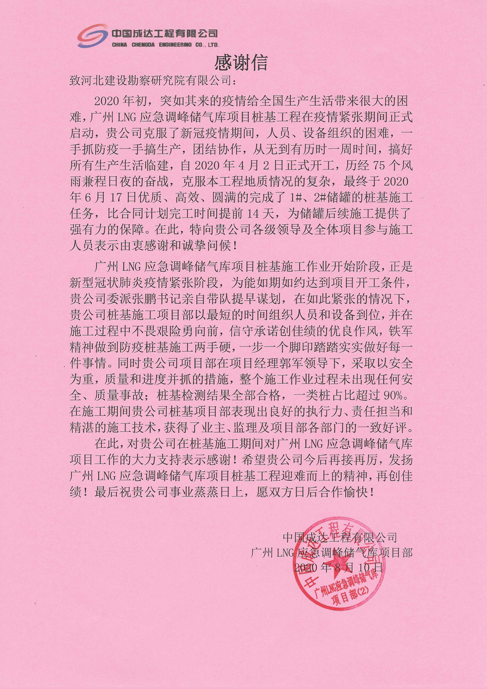 近日,我公司廣州LNG應(yīng)急調(diào)峰儲(chǔ)氣庫(kù)項(xiàng)目收到成達(dá)公司發(fā)放的感謝信。廣州LNG應(yīng)急調(diào)峰項(xiàng)目是我公司首次在LNG行業(yè)打入廣州市場(chǎng),也是首次和中國(guó)成達(dá)工程公司進(jìn)行合作,項(xiàng)目部全體員工發(fā)揚(yáng)公司的鐵軍精神做到防疫施工兩手硬,不畏艱險(xiǎn)勇向前,齊心協(xié)力、積極策劃,圓滿(mǎn)的完成了各項(xiàng)任務(wù),為廣州LNG應(yīng)急調(diào)峰項(xiàng)目順利實(shí)施打下良好的基礎(chǔ);在施工中,項(xiàng)目安全生產(chǎn)管理到位,質(zhì)量工藝管控優(yōu)良,贏得了業(yè)主、監(jiān)理及相關(guān)各方高度認(rèn)可。對(duì)全體參建本項(xiàng)目的領(lǐng)導(dǎo)與員工表示了衷心的感謝,并希望在后續(xù)的工程建設(shè)中,繼續(xù)發(fā)揚(yáng)河北建勘的優(yōu)良工作作風(fēng)!