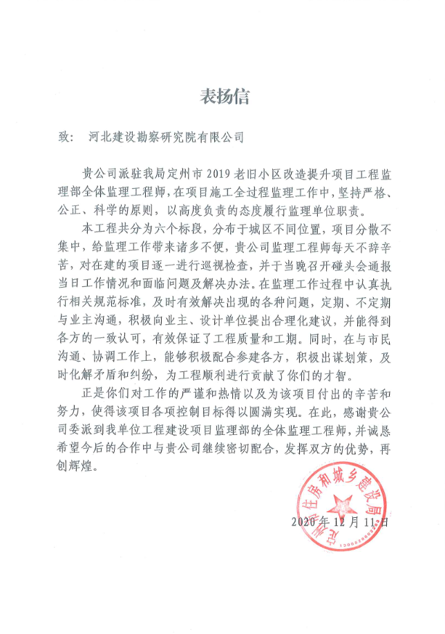 2020年12月我公司收到來自定州市住房和城鄉(xiāng)建設(shè)局關(guān)于定州市2019老舊小區(qū)改造提升項目監(jiān)理工程的表揚信,目前該項目已順利竣工驗收。雖然該項目要求時間緊、任務(wù)重,但在監(jiān)理過程中我們公司嚴格按照相關(guān)規(guī)范、標準,科學(xué)管理,嚴謹認真負責(zé)的工作作風(fēng),保證了該項目按期完工,給各方留下了深刻的印象,不僅得到了定州市住房和城鄉(xiāng)建設(shè)局的高度認可和贊譽,還贏得了周邊市民的一致好評,樹立了良好的口碑和信譽,為躋身定州建筑市場更好擴展業(yè)務(wù)奠定了基礎(chǔ)。