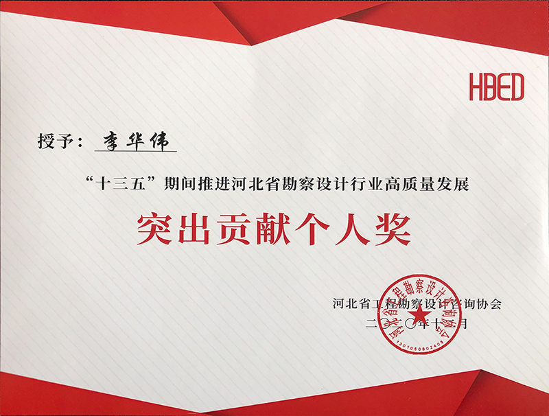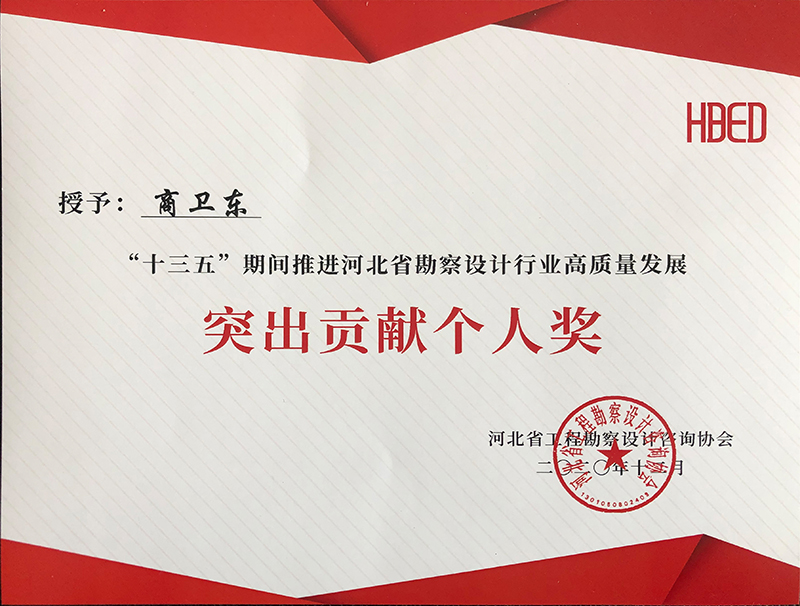 由河北省工程勘察設計咨詢協(xié)會評選,公司榮獲“十三五”期間推進河北省勘察設計行業(yè)高質量發(fā)展突出貢獻單位,韓立君董事長、李華偉總經理、商衛(wèi)東主任榮獲“十三五”期間“推進河北省勘察設計行業(yè)高質量發(fā)展突出貢獻個人”。