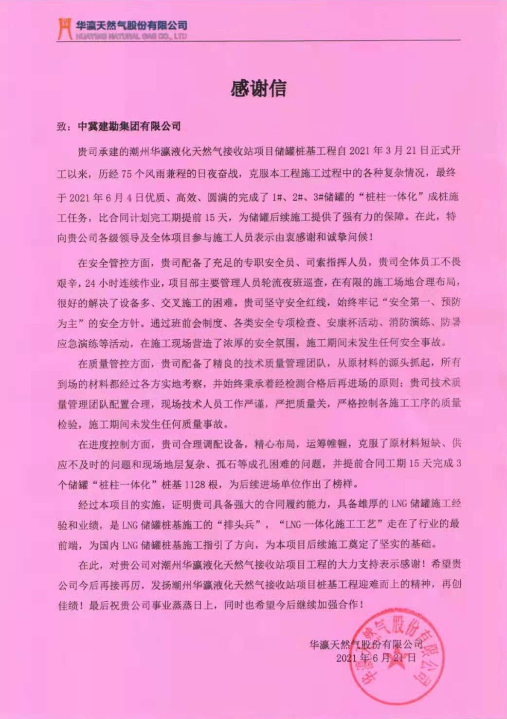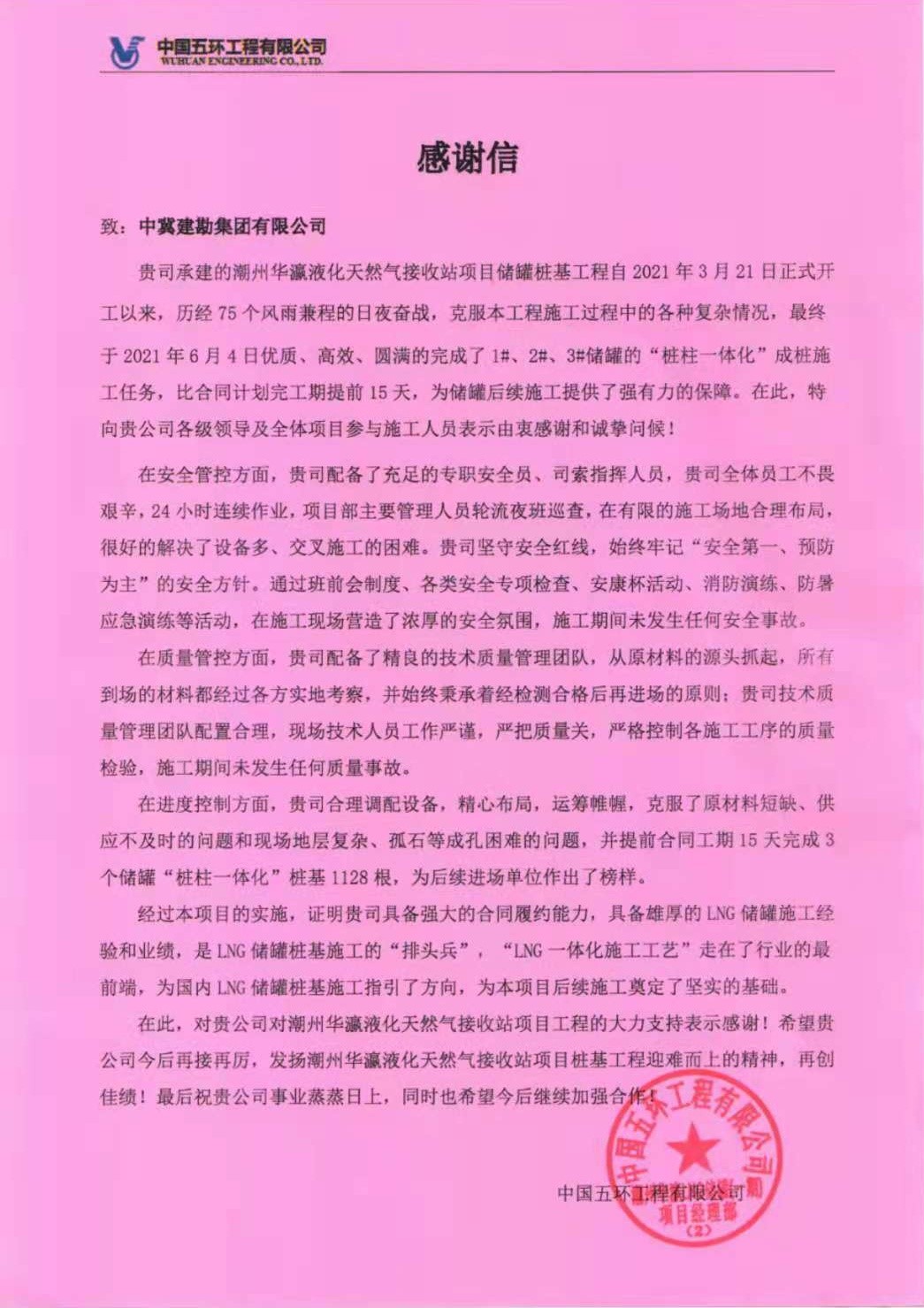 近日,由我公司承建的潮州華瀛液化天然氣接收站項(xiàng)目儲罐工程樁基施工項(xiàng)目,榮獲華瀛天然氣股份有限公司和中國五環(huán)工程有限公司潮州華瀛LNG項(xiàng)目部頒發(fā)的“優(yōu)秀承包商”、“質(zhì)量管理先進(jìn)單位”和“優(yōu)秀HSE管理團(tuán)隊(duì)”的榮譽(yù)獎牌以及感謝信。