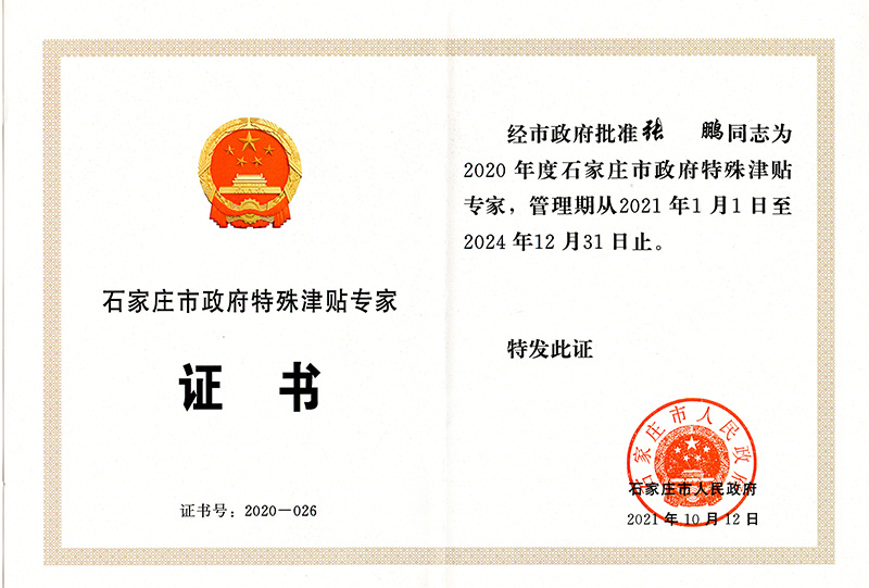 經(jīng)公司組織申報,石家莊市人力資源和社會保障局組織評審,石家莊市人民政府批準,我公司張鵬同志榮獲石家莊市政府特殊津貼專家稱號。