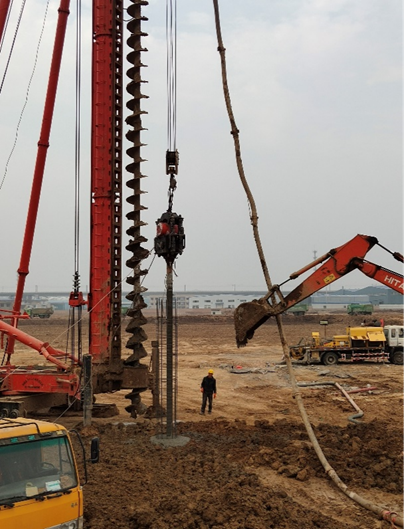 本工程2#、3#廠房樁基成孔采用長螺旋后插筋工藝,混凝土壓灌完成后,進行鋼筋籠安放工作,鋼筋籠安放采用25T吊車和振桿、震動器(采用閉合式鏈接)配合進行。鋼筋籠下入孔中后,保證在孔內(nèi)居中,先由鋼筋籠量與振錘自身的重量讓鋼筋籠自行下沉,當(dāng)不能自行下沉?xí)r(約達到3/1-3/2籠長時),立即開動震錘,邊振動混凝時鋼筋籠邊隨著下沉,鋼筋籠隨著振動下沉至到樁頂標(biāo)高位置后,采用雙吊筋固定鋼筋籠位置,緩慢將導(dǎo)管從樁身中拔出,并開動震錘,即完成了該樁的施工。當(dāng)遇見孔口下沉現(xiàn)象時,先用人工清理出表面混凝土,再由鉆機開至孔口進行補方。