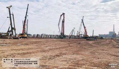 本工程位于廣西欽州港。受廣西華誼新材料有限公司委托,我公司承擔(dān)本項目樁基施工。采用自有的“樁柱一體”施工工法、長臂挖掘機振動下設(shè)長護筒、標(biāo)準(zhǔn)化泥漿池、快速機械連接、旋挖鉆機入巖等施工工藝和新方法共計完成4093根灌注樁,PHC管樁1759根。