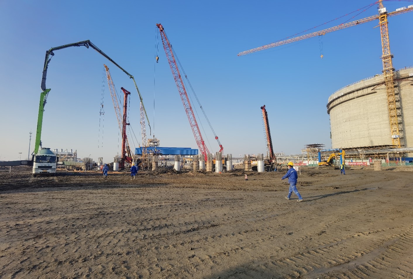 本項目位于江蘇省啟東市,由廣匯能源綜合物流發(fā)展有限責任公司投資建設,我公司承擔本項目樁基施工。樁基為鋼筋混凝土灌注樁,罐下布置400根樁,樁間距最小距離為3.025m,樁徑均為1200mm。施工采用樁柱一體化施工工藝,成孔采用旋挖鉆機成孔。共計施工完成400根樁,于2021年10月25日開工,完工時間為2022年01月25日,實際工期完成情況滿足合同工期要求。