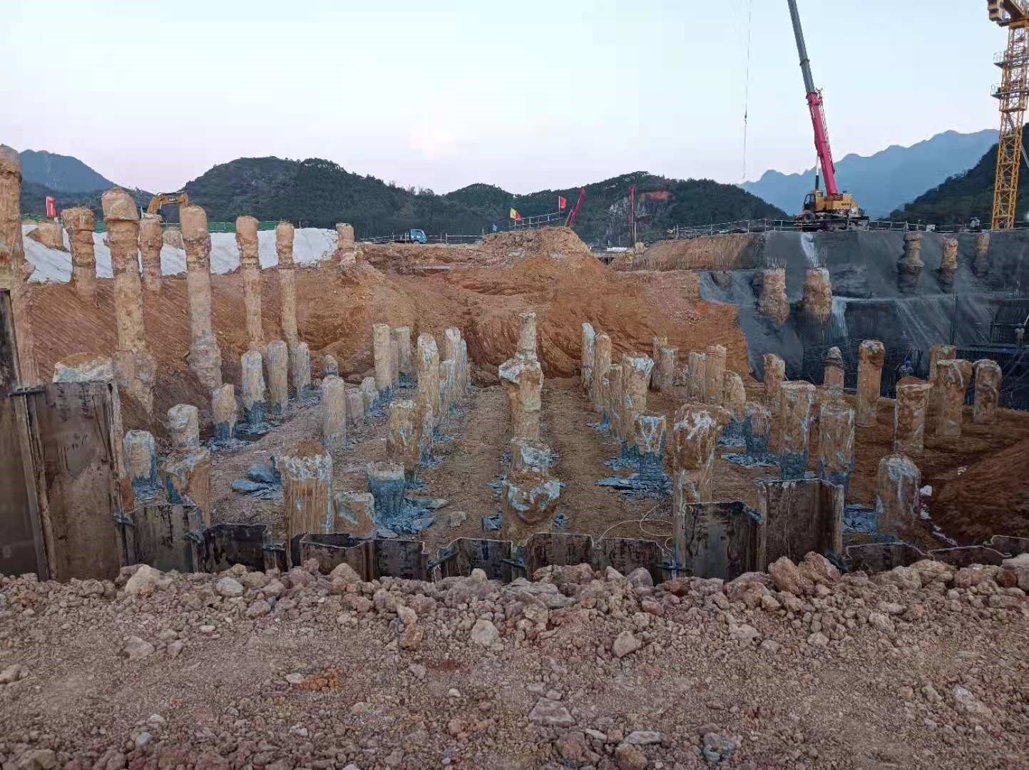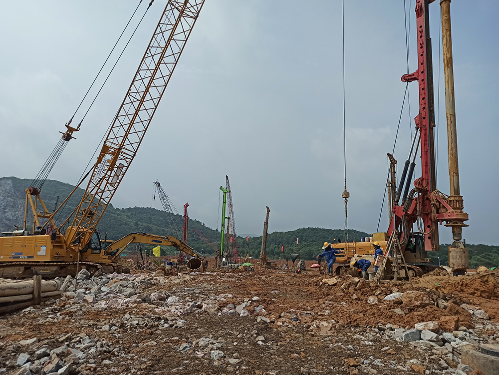 本工程于2021年04月10日開工,2022年01月27日現(xiàn)場樁基施工完工,工程施工期間累計投入施工人員200余人和大功率旋挖鉆機10臺以及相關(guān)匹配的機械設(shè)備。克服了雨季、高溫和地質(zhì)條件復(fù)雜等諸多不利因素,累計完成鉆孔灌注樁1857根,處理溶洞約31000m³(含回填片石、水泥、C20砼及注漿和遇溶洞樁超灌混土量)。