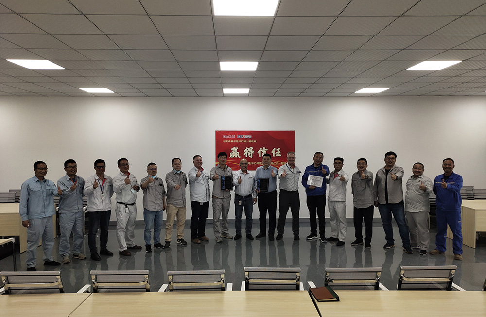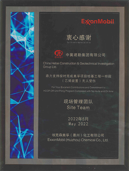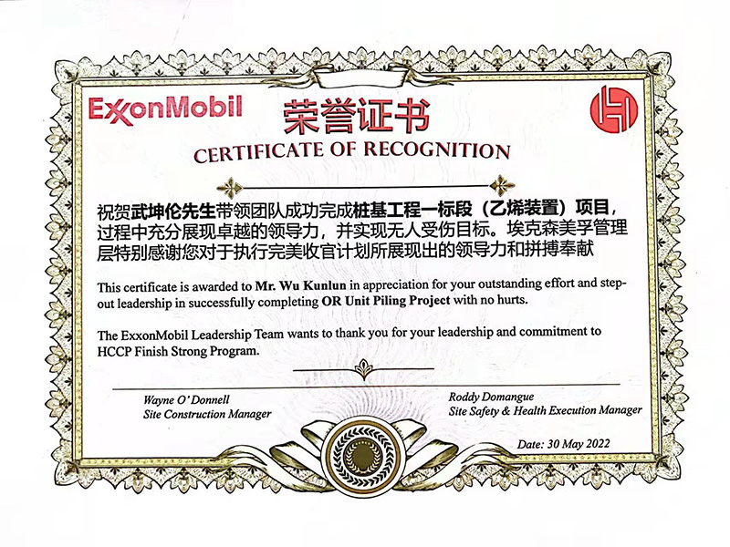 5月30日,??松梨冢ɑ葜荩┗び邢薰菊匍_2022年工作表彰大會,我公司參建的惠州美孚乙烯一期樁基工程項(xiàng)目部,在參建的30余家施工單位中以優(yōu)異的成績,榮獲“優(yōu)秀管理團(tuán)隊(duì)”稱號,生產(chǎn)設(shè)備科科長兼項(xiàng)目經(jīng)理武坤倫榮獲 “卓越領(lǐng)導(dǎo)力”個人榮譽(yù)證書,項(xiàng)目部每位員工都收到了業(yè)主頒發(fā)的獎品。