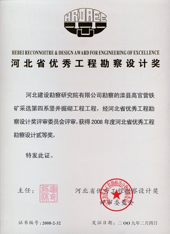 灤縣高官營鐵礦采選第四采豎井掘砌工程獲河北省優(yōu)秀工程勘察設(shè)計(jì)二等獎(jiǎng)。