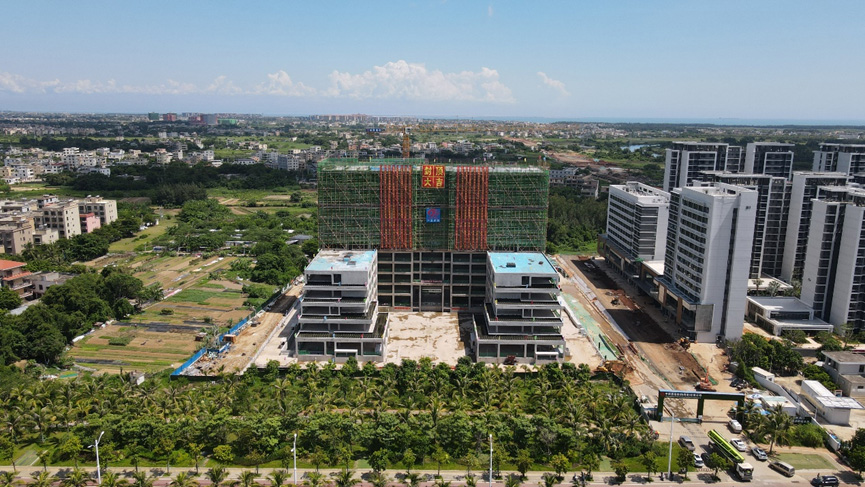 海南辦公樓占地面積15畝,地下二層,地上12層,總建筑面積47527平方米。工程自2021年9月13日現(xiàn)場(chǎng)舉辦開工儀式以來,經(jīng)過11個(gè)月的合力攻堅(jiān),克服高溫、臺(tái)風(fēng)、疫情等重重難關(guān),如期實(shí)現(xiàn)了一個(gè)個(gè)關(guān)鍵節(jié)點(diǎn):2021年10月25日第一根基礎(chǔ)工程樁混凝土灌注順利完成;2021年12月4日開始8萬方土方開挖的任務(wù);2022年1月29日,實(shí)現(xiàn)了基礎(chǔ)筏板的澆筑;2022年4月10日,完成了地下二層車庫施工,主體如期“沖”出正負(fù)零;2022年6月24日,東、西配樓主體按計(jì)劃日期封頂。如今項(xiàng)目迎來了主體封頂?shù)睦锍瘫?,為后期工程樹立了?biāo)桿!