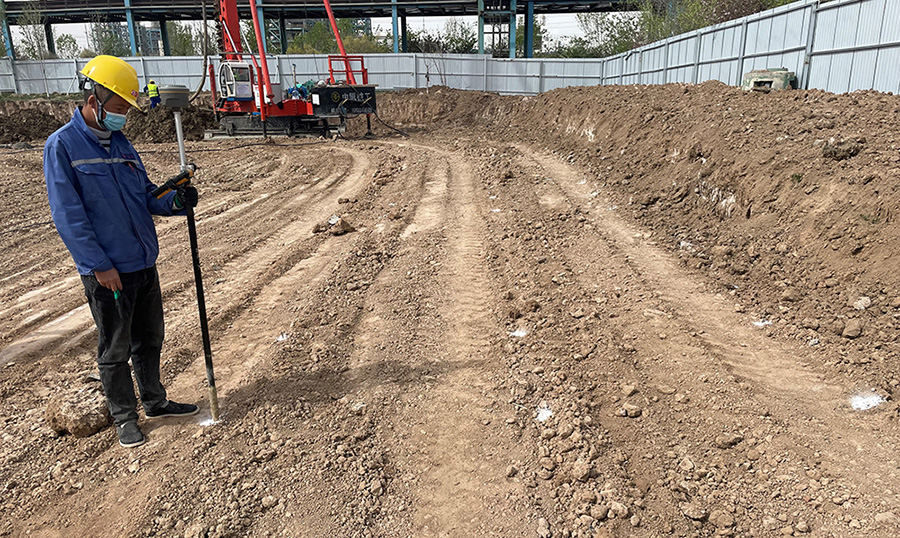 本工程自2022年4月19日開工,2022年6月18日完工,包含CFG樁施工,樁間土開挖及外運(yùn),截樁頭,樁基檢測,褥墊層施工和工程降水。其中鑄造車間共有CFG樁約900根,樁徑為500mm,有效樁長為14.5-15.0m,土方開挖及外運(yùn)約1200m³,樁間土開挖及外運(yùn)約2500m³,褥墊層鋪設(shè)約680m³;2萬噸聯(lián)合法車間共有CFG樁約3900根,樁徑為500mm,有效樁長為13m,土方開挖及外運(yùn)約8000m³,樁間土開挖及外運(yùn)約4400m³,褥墊層鋪設(shè)約2500m³。