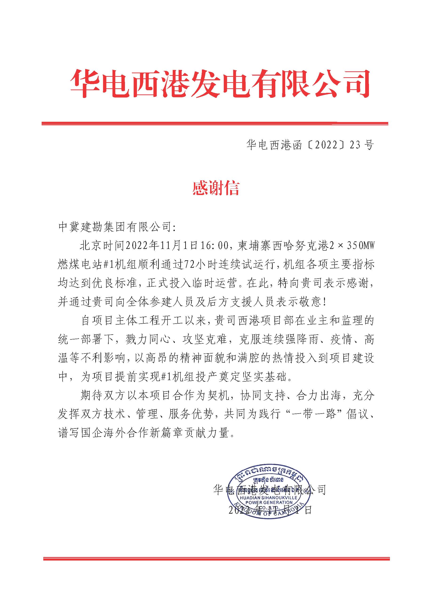 北京時(shí)間2022年11月1日16:00,由我公司承建的柬埔寨西哈努克港2×350MW燃煤電站#1機(jī)組順利通過柬埔寨國(guó)家電力公司要求的滿負(fù)荷性能試驗(yàn),標(biāo)志著中國(guó)華電在柬投資興建的最大火電項(xiàng)目首臺(tái)機(jī)組正式投產(chǎn)發(fā)電。該項(xiàng)目是中國(guó)華電在“一帶一路”沿線國(guó)家投資建設(shè)的重點(diǎn)工程,也是目前中國(guó)在柬單體投資最大電源項(xiàng)目。業(yè)主華電西港發(fā)電有限公司特向我公司表示感謝,并對(duì)我公司全體參建人員及后方支持人員表示敬意!