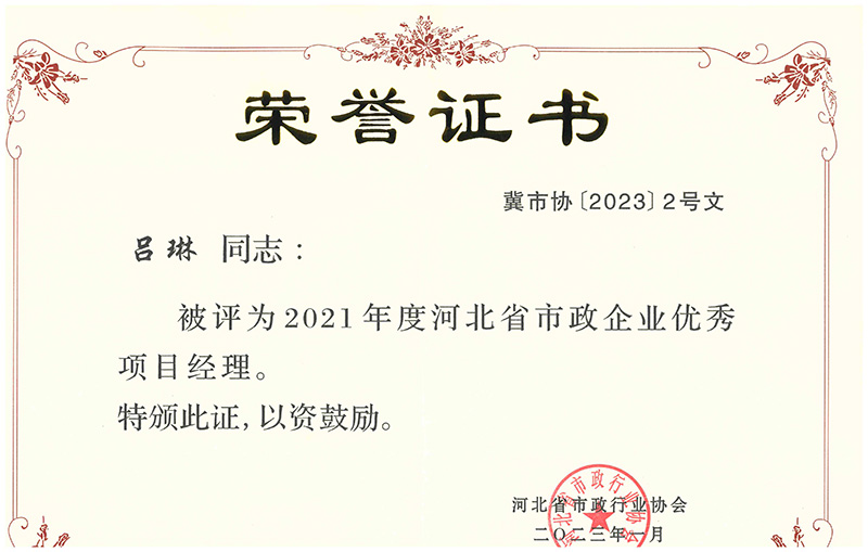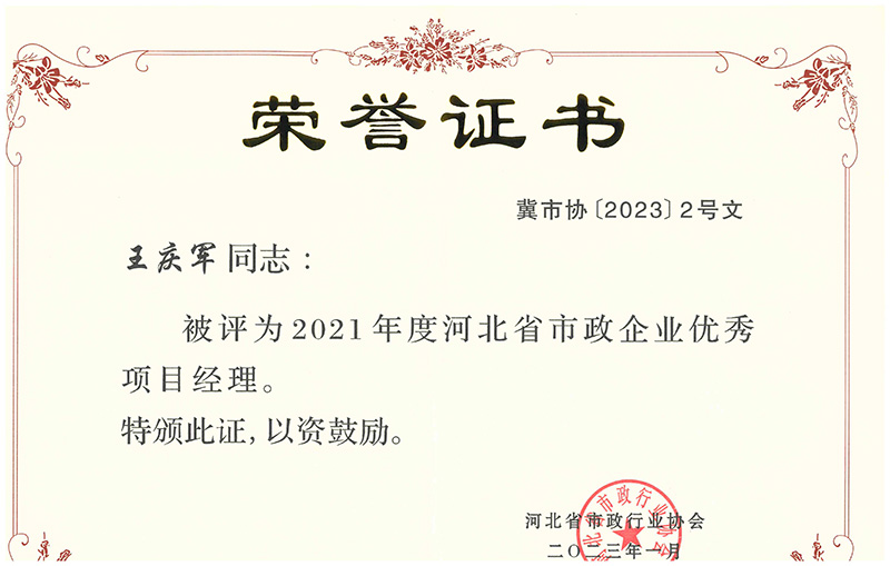 近日,經(jīng)河北省市政行業(yè)協(xié)會(huì)組織選拔并發(fā)文公布,我公司王慶軍同志、呂琳同志榮獲 “2021年度河北省市政企業(yè)優(yōu)秀項(xiàng)目經(jīng)理” 榮譽(yù)稱號(hào);陳軍紅同志、張樹(shù)楹同志榮獲“2022年度河北省市政企業(yè)優(yōu)秀項(xiàng)目總工程師”榮譽(yù)稱號(hào)。