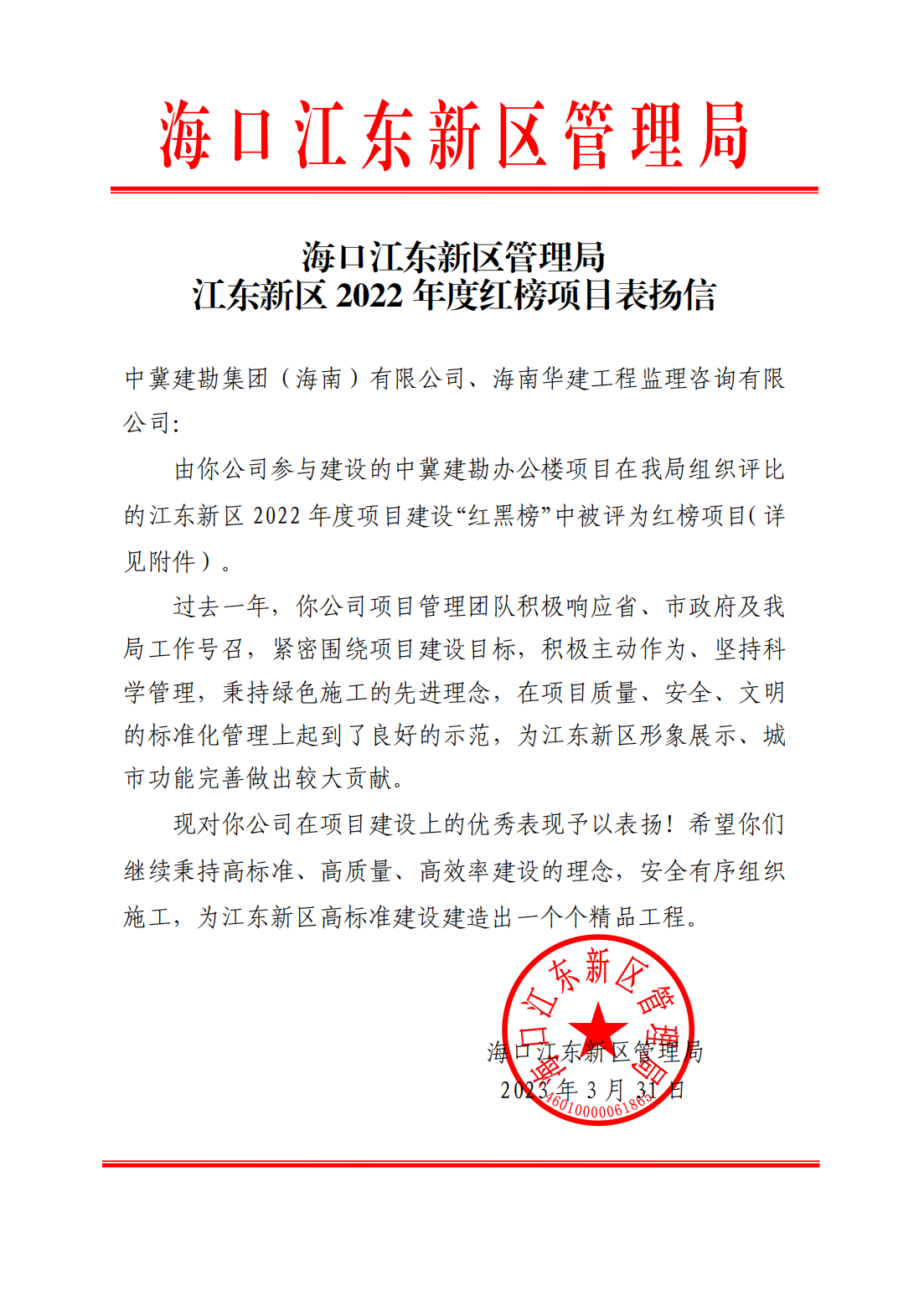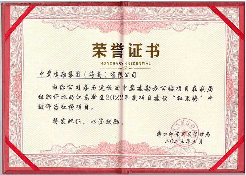 人勤春來(lái)早,實(shí)干正當(dāng)時(shí)。2023年3月31日,為促進(jìn)項(xiàng)目建設(shè)進(jìn)度,營(yíng)造“安全、文明、有序”的建設(shè)氛圍,海口江東新區(qū)管理局公布了2022年度項(xiàng)目建設(shè)“紅黑榜”,“中冀建勘辦公樓”項(xiàng)目再次受到表彰,并為項(xiàng)目頒發(fā)了榮譽(yù)證書(shū)。