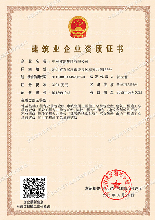 集團(tuán)公司于2023年8月24日喜獲電力工程施工總承包貳級資質(zhì),該資質(zhì)的取得將大力促進(jìn)我公司在電力能源市場的業(yè)務(wù)拓展能力,由電力項(xiàng)目的地基基礎(chǔ)專業(yè)承包向土建、安裝總成承包邁進(jìn),為獨(dú)立承接風(fēng)電、光電等電力新能源項(xiàng)目提供了準(zhǔn)入證。