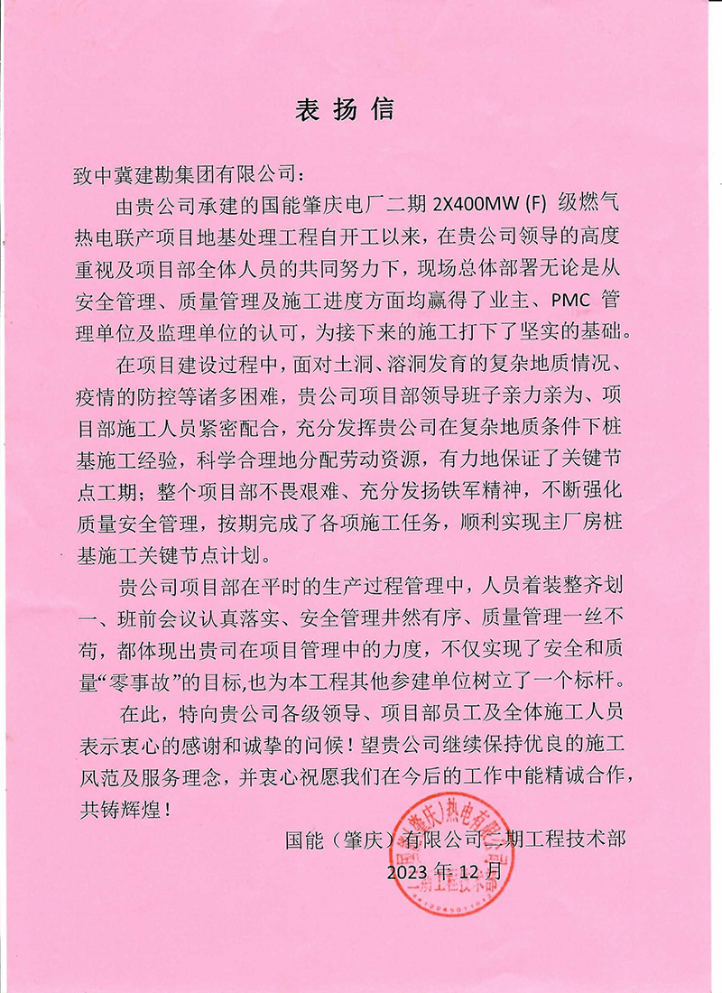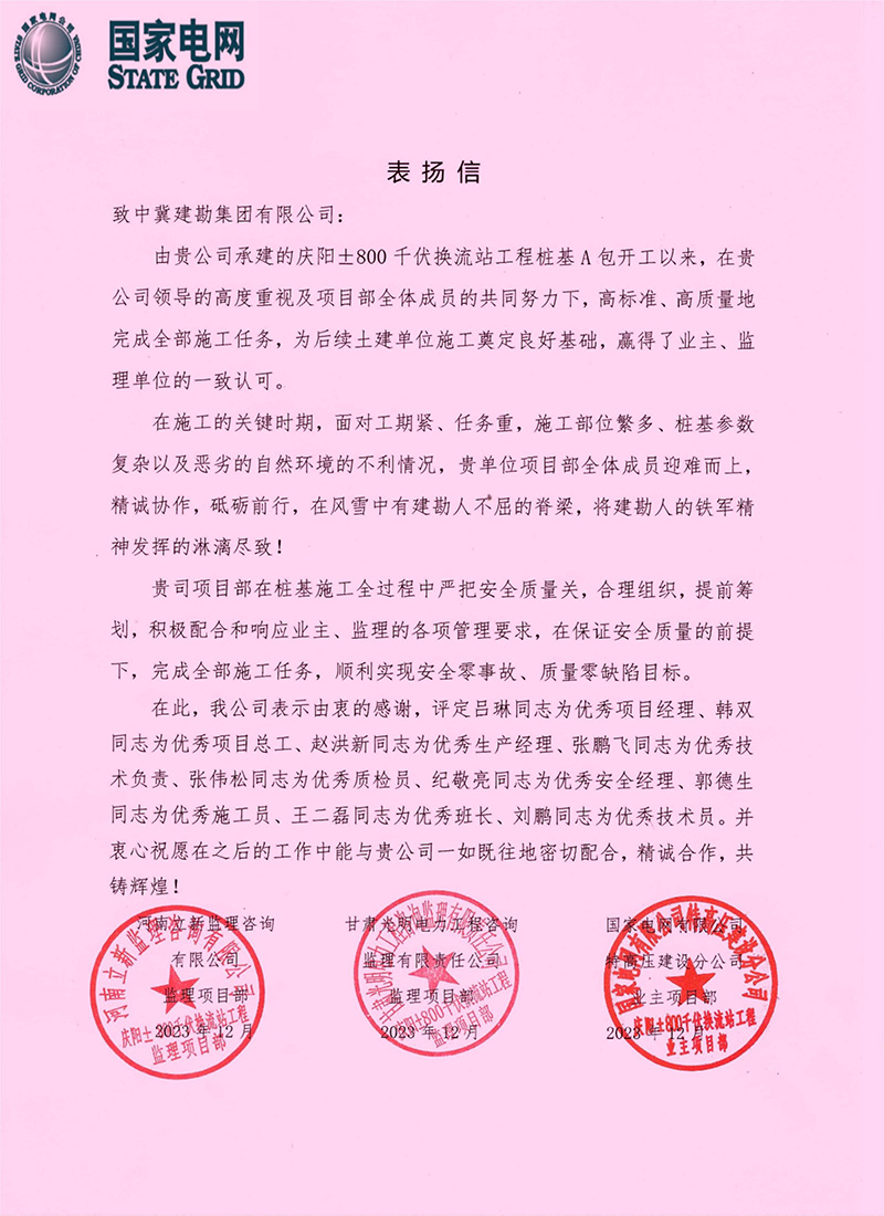 公司收到了國(guó)家電網(wǎng)慶陽±800千伏換流站工程由業(yè)主國(guó)家電網(wǎng)和監(jiān)理單位河南立新及甘肅光明的聯(lián)合表揚(yáng)信,表揚(yáng)信中說在我公司領(lǐng)導(dǎo)的高度重視及項(xiàng)目部全體成員的共同努力下,高標(biāo)準(zhǔn)、高質(zhì)量地完成施工任務(wù),為后續(xù)土建單位施工奠定良好基礎(chǔ),贏得了業(yè)主、監(jiān)理單位的一致認(rèn)可。在施工的關(guān)鍵時(shí)期,我單位項(xiàng)目部全體成員迎難而上,精誠(chéng)協(xié)作,砥礪前行,在風(fēng)雪中有建勘人不屈的脊梁,將建勘人的鐵軍精神發(fā)揮的淋漓盡致!