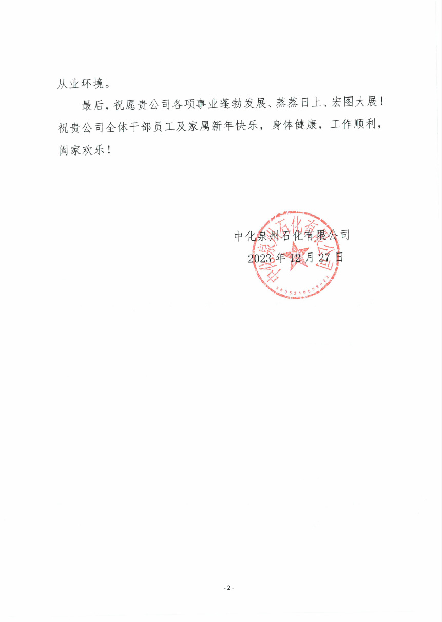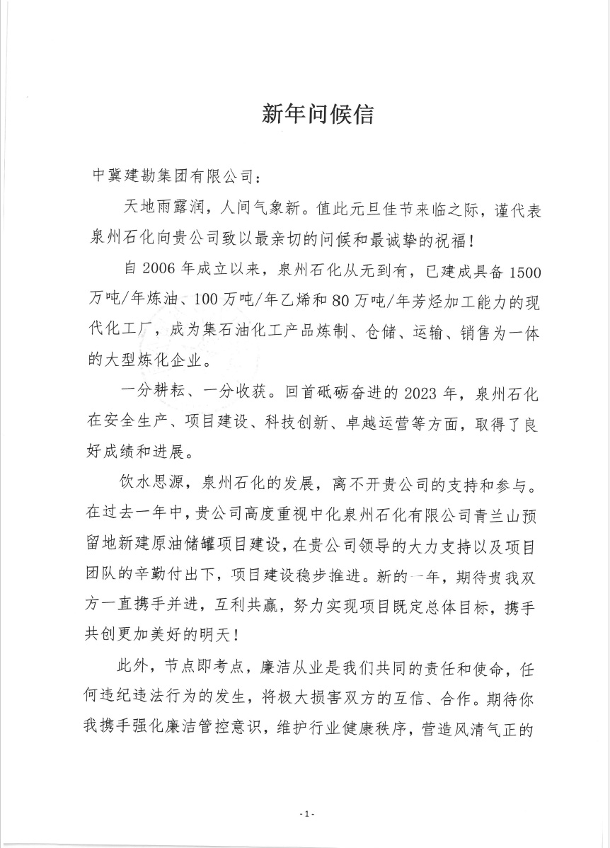 中化泉州石化有限公司為我公司發(fā)來了新年問候信,信中中化泉州石化有限公司肯定了我公司對(duì)中化泉州石化有限公司青蘭山預(yù)留地新建原油儲(chǔ)罐項(xiàng)目建設(shè)的重視;看到了我公司及項(xiàng)目施工人員為項(xiàng)目的辛勤付出;并期望在新的一年里加強(qiáng)合作,再創(chuàng)新業(yè)績(jī)。