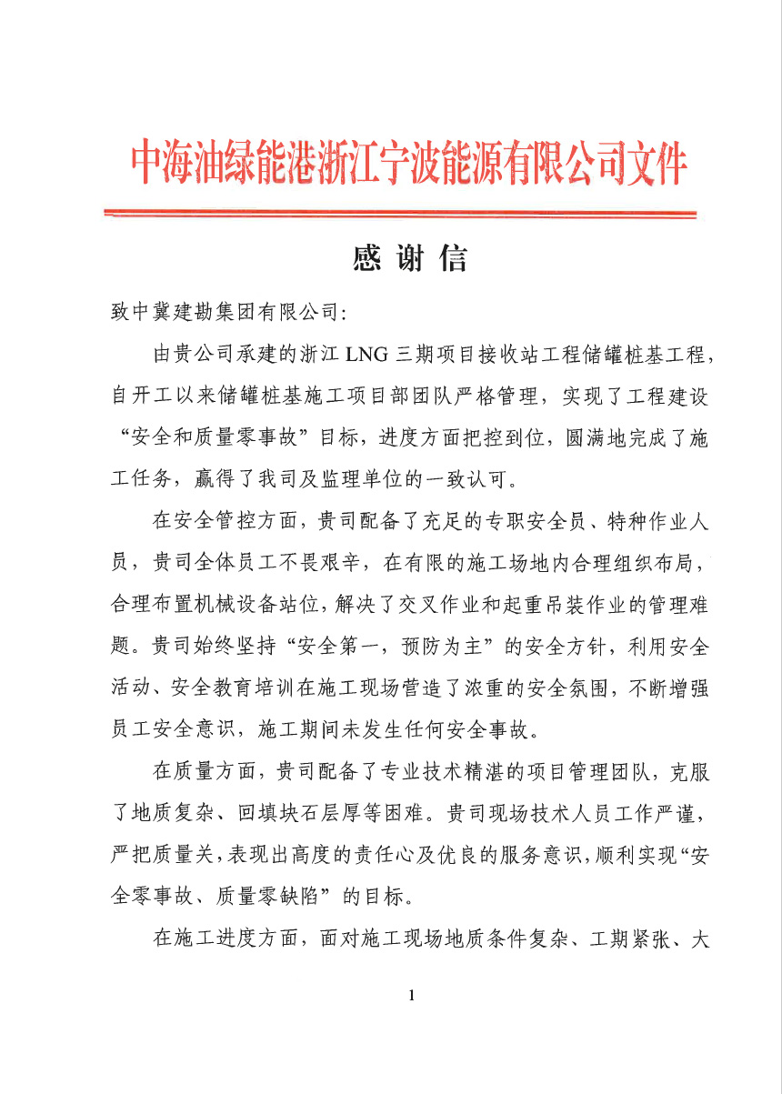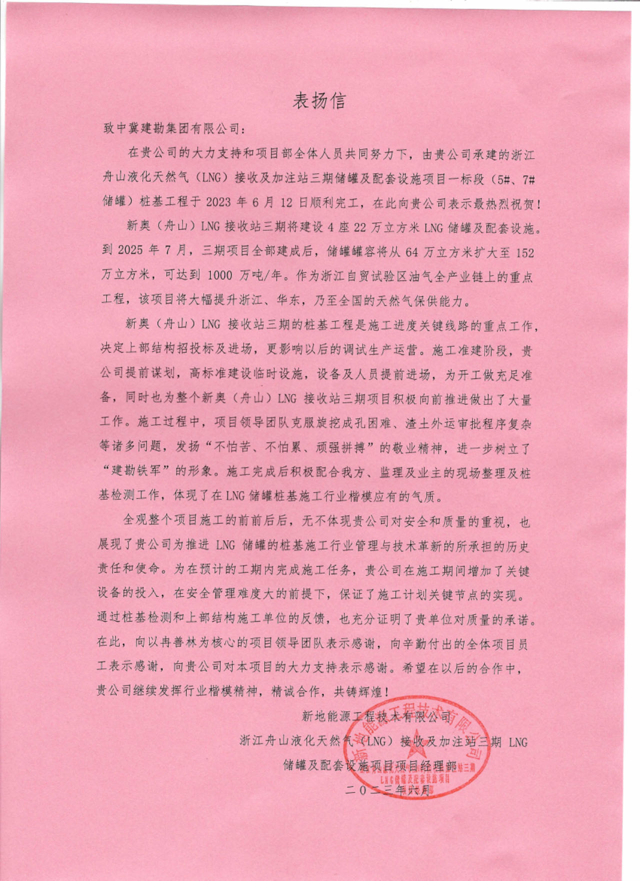 浙江舟山液化天然氣(LNG)接收及加注站三期LNG儲(chǔ)罐及配套設(shè)施項(xiàng)目(5#、7#儲(chǔ)罐樁基工程)于2023年6月25日收到新地能源工程技術(shù)有限公司發(fā)來的表揚(yáng)信。自開工以來,在公司的大力支持和項(xiàng)目部全體員工的共同努力下,精心組織、全力布局,克服了前期施工任務(wù)重等諸多困難,安全、高效、優(yōu)質(zhì)的完成了儲(chǔ)罐的樁基施工任務(wù),有力保障了本項(xiàng)目總體工期計(jì)劃,贏得了監(jiān)理單位和業(yè)主單位的一致認(rèn)可和好評(píng)。