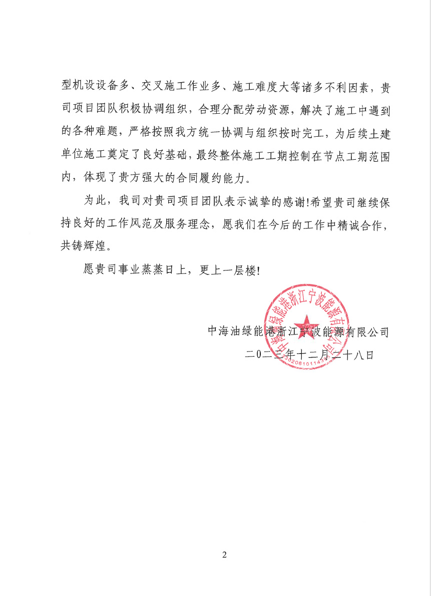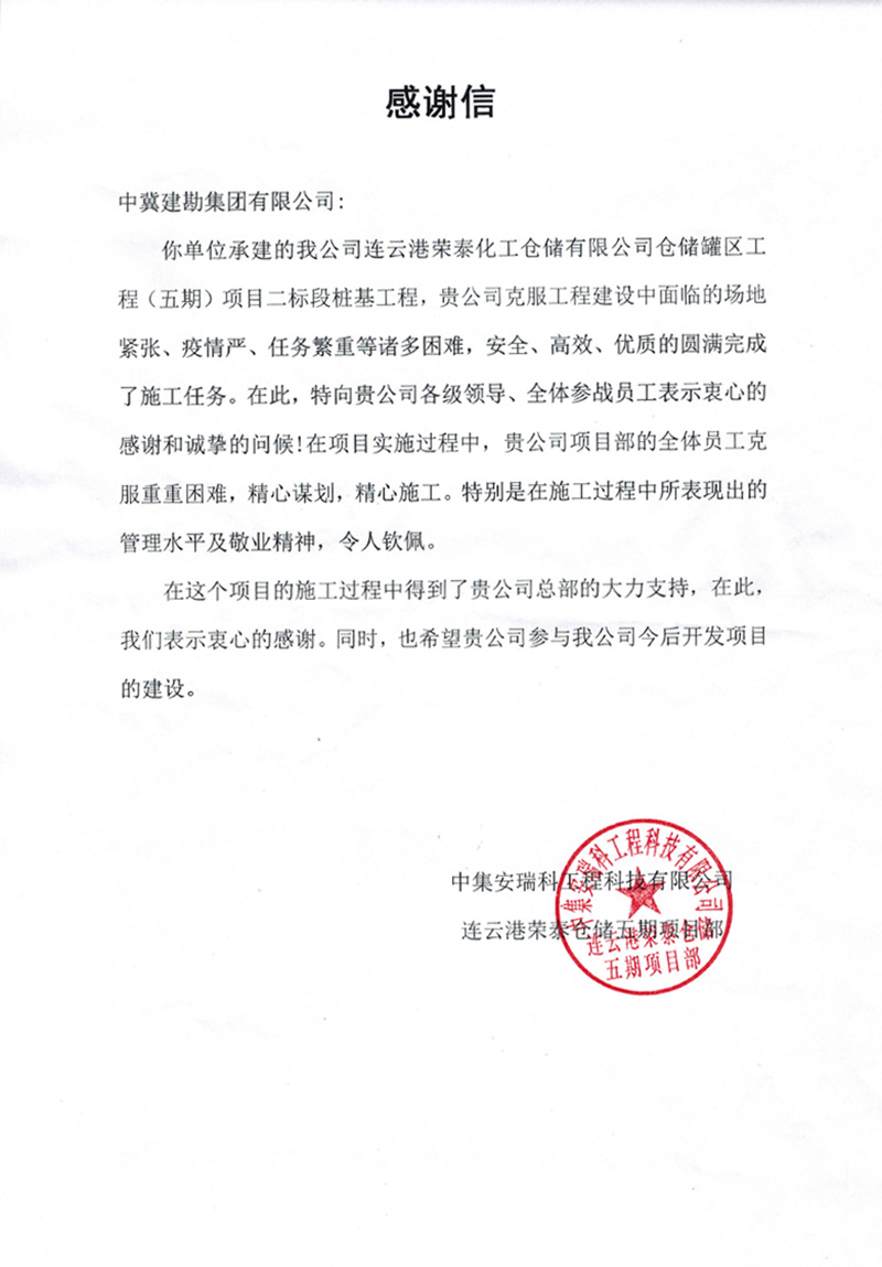 連云港榮泰化工倉儲(chǔ)有限公司倉儲(chǔ)罐區(qū)工程(五期)項(xiàng)目二標(biāo)段樁基工程,業(yè)主在表揚(yáng)信中說:貴公司克服工程建設(shè)中面臨的場(chǎng)地緊張、疫情嚴(yán)、任務(wù)繁重等諸多困難,安全、高效、優(yōu)質(zhì)的圓滿完成了施工任務(wù)。貴公司項(xiàng)目部全體員工克服重重困難,精心謀劃,精心施工。特別是在施工中所表現(xiàn)出的管理水平及敬業(yè)精神,令人欽佩。