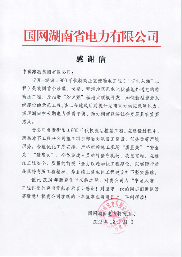 國(guó)家電網(wǎng)湖南電力特高壓辦,為我公司承建的衡陽±800千伏換流站工程樁基項(xiàng)目部發(fā)來感謝信一封。感謝信內(nèi)容主要表達(dá)了,面對(duì)項(xiàng)目的工期緊,任務(wù)重等關(guān)鍵形勢(shì),稱贊我公司能嚴(yán)格把質(zhì)量關(guān),安全關(guān)和進(jìn)度關(guān)。