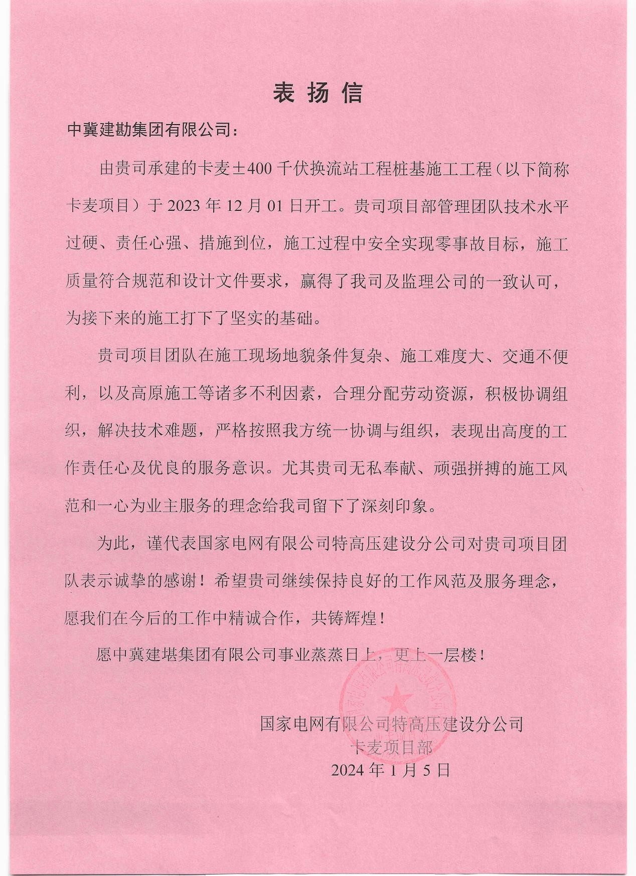卡麥±400千伏換流站工程樁基施工工程收到業(yè)主國(guó)家電網(wǎng)有限公司特高壓建設(shè)分公司發(fā)來的表揚(yáng)信。項(xiàng)目部敢打硬仗的精神面貌,贏得了業(yè)主方的高度贊賞和認(rèn)可。