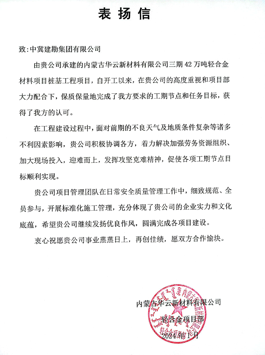 內(nèi)蒙古華云新材料有限公司三期42萬噸輕合金材料項(xiàng)目樁基工程,在工程建設(shè)過程中,面對(duì)前期的不良天氣及地質(zhì)條件復(fù)雜等諸多不利因素影響,積極協(xié)調(diào)各方,著力解決加強(qiáng)勞務(wù)資源組織、加大現(xiàn)場(chǎng)投入,迎難而上,發(fā)揮攻堅(jiān)克難精神,保質(zhì)保量地完成了工期節(jié)點(diǎn)和任務(wù)目標(biāo),獲得甲方的認(rèn)可。