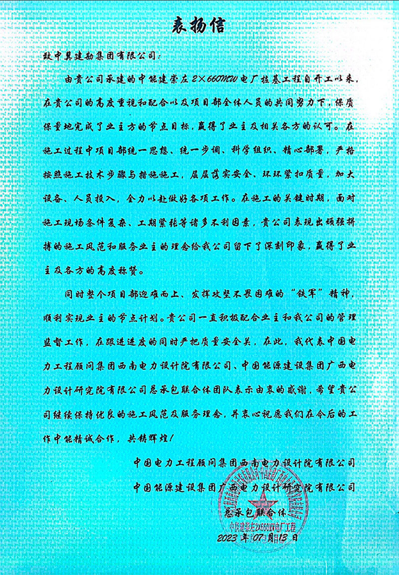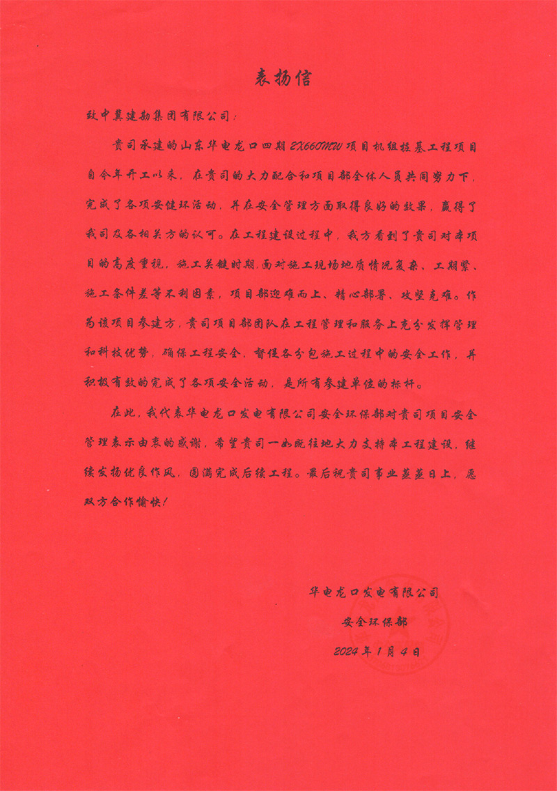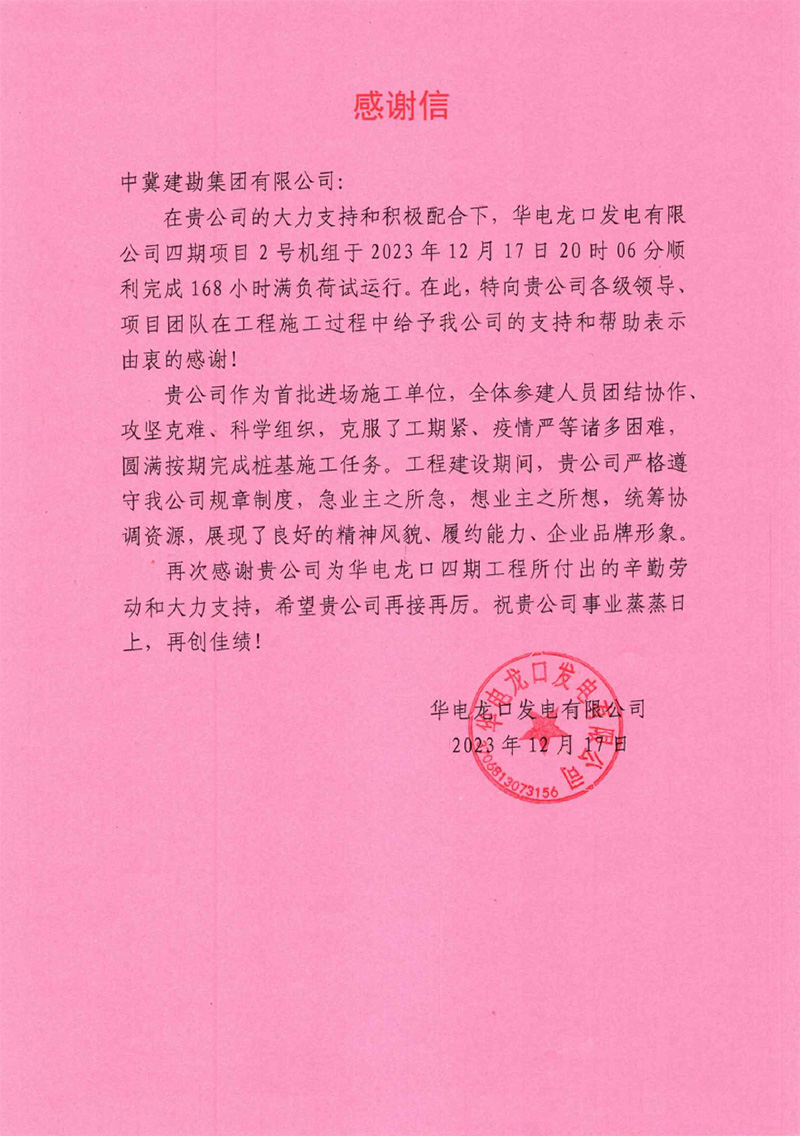 華電龍口發(fā)電有限公司四期項(xiàng)目2號(hào)機(jī)組于2023年12月17日20時(shí)04分順利完成168小時(shí)滿負(fù)荷試運(yùn)行。工程建設(shè)期間,完成了各項(xiàng)安健環(huán)活動(dòng),并在安全管理方面取得良好的效果,贏得了業(yè)主方認(rèn)可。我公司人員嚴(yán)格遵守我公司規(guī)章制度,急業(yè)主之所急,想業(yè)主之所想,統(tǒng)籌協(xié)調(diào)資源,展現(xiàn)了良好的精神風(fēng)貌、履約能力、企業(yè)品牌形象。為此,業(yè)主特向我公司各級(jí)領(lǐng)導(dǎo)、項(xiàng)目團(tuán)隊(duì)在工程施工過程中給予的支持和幫助表示由衷感謝。