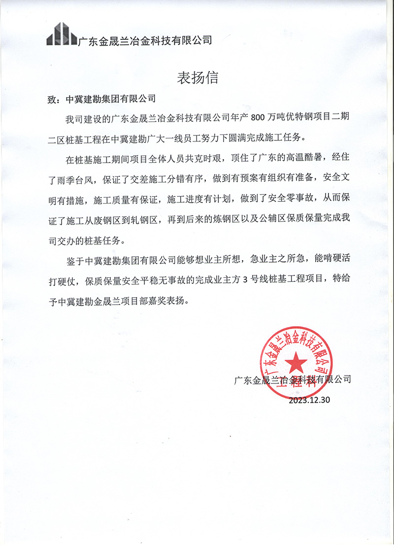 廣東金盛蘭冶金科技有限公司年產(chǎn)800萬噸優(yōu)特鋼項(xiàng)目二期二區(qū)樁基工程,在施工期間項(xiàng)目全體人員共克時(shí)艱,頂住了廣東的高溫酷暑,經(jīng)住了雨季臺(tái)風(fēng),保證了交差施工分錯(cuò)有序,做到了預(yù)案有組織有準(zhǔn)備,安全文明有措施,施工質(zhì)量有保證,施工進(jìn)度有計(jì)劃,做到了安全零事故,保質(zhì)保量的完成任務(wù),業(yè)主對(duì)項(xiàng)目給予嘉獎(jiǎng)表揚(yáng)。