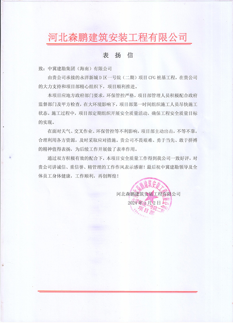 廣西石化煉化項(xiàng)目部接收到大慶石化工程有限公司全密度聚乙烯工程建設(shè)部項(xiàng)目經(jīng)理牛家偉發(fā)來的表揚(yáng)信,信中肯定了我項(xiàng)目部在廣西石化煉化項(xiàng)目樁基工程中所取得的成果。