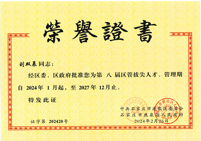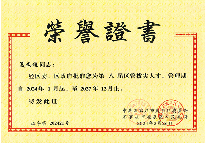 經(jīng)公司組織申報(bào),中共石家莊市鹿泉區(qū)委員會組織資格審核、綜合評審、征求意見、實(shí)地考察、區(qū)委常委會議研究等程序,我公司夏文超、劉雙辰入選石家莊市鹿泉區(qū)第八屆拔尖人才。