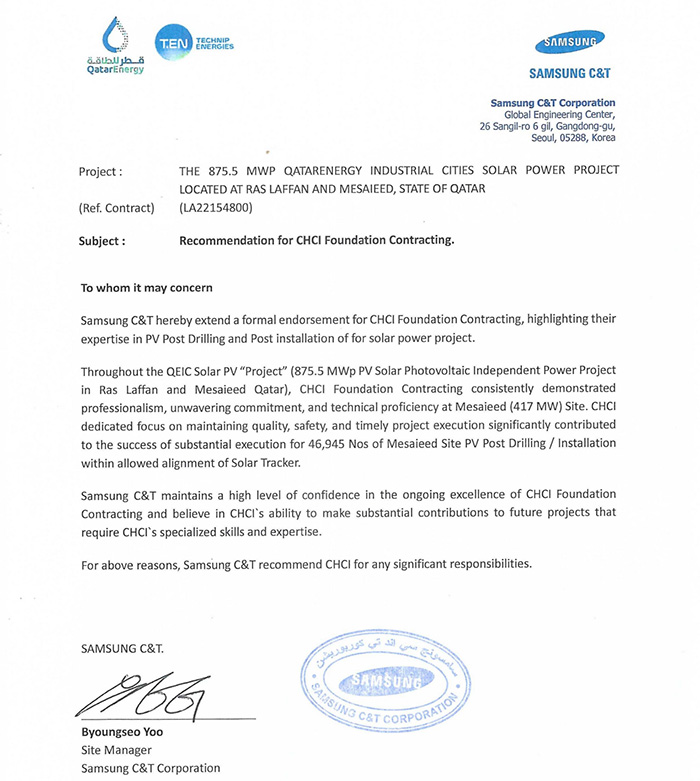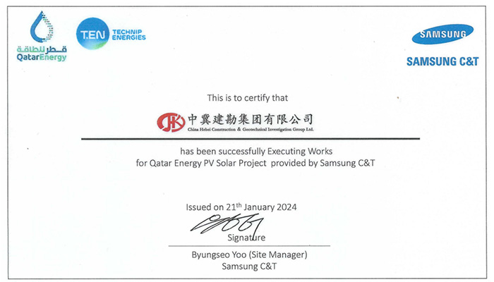 我公司收到卡塔爾能源875.5MW光伏發(fā)電項(xiàng)目業(yè)主方卡塔爾能源和總包方三星C&T公司聯(lián)合頒發(fā)的獎(jiǎng)杯和推薦信。業(yè)主及總包方高度認(rèn)可我公司項(xiàng)目履約能力,贊揚(yáng)我司對(duì)該項(xiàng)目成功交付做出重大貢獻(xiàn),表示愿意與我司建立長(zhǎng)期合作關(guān)系?;谖宜咀吭降穆募s表現(xiàn),三星C&T公司授予我司推薦信。
