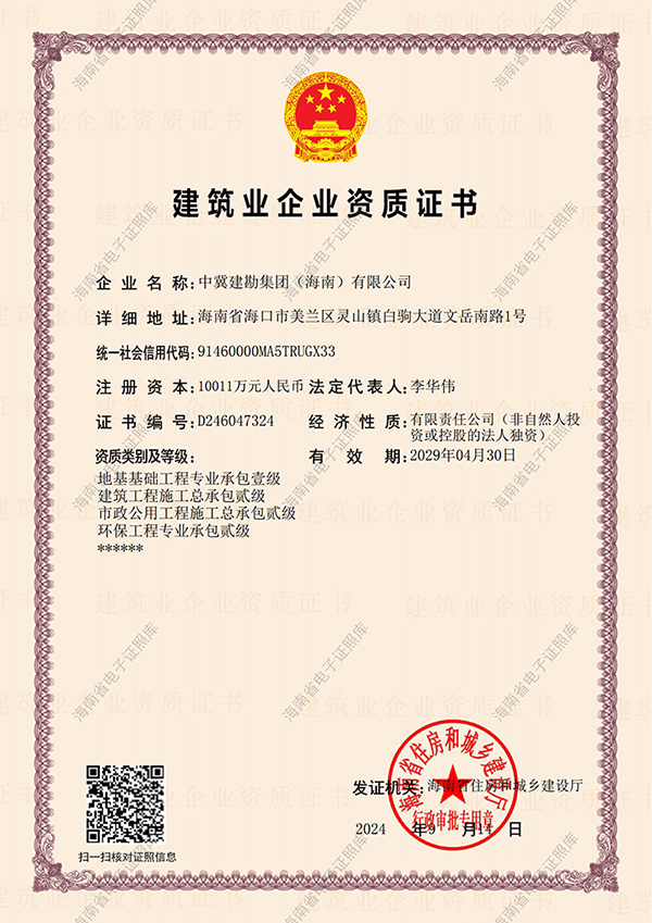按照公司發(fā)展規(guī)劃,經(jīng)過近半年的努力,海南公司于2024年9月14日通過海南省住建廳審查,成功將地基與基礎(chǔ)工程專業(yè)承包貳級晉升為壹級。此項壹級資質(zhì)的取得,是海南公司資質(zhì)實力質(zhì)的飛躍,為海南公司持續(xù)發(fā)展,為公司實施“雙總部建設(shè)”,構(gòu)建“一業(yè)為主,適度多元化發(fā)展”戰(zhàn)略打下了堅實的基礎(chǔ)。