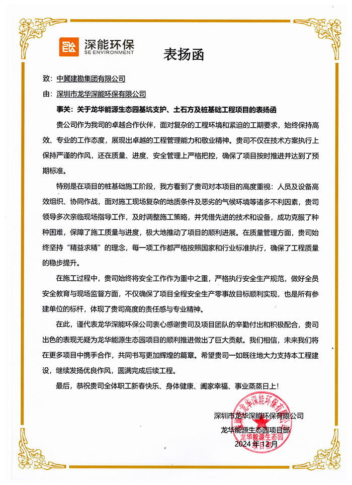 2024年12月20日,深圳市龍華深能環(huán)保有限公司發(fā)來表揚信,對我公司正在施工的龍華能源生態(tài)源基坑支護、土石方及樁基礎工程項目在施工過程中,面對復雜的工程環(huán)境和緊迫的工期要求,始終保持高效、專業(yè)的工作態(tài)度,展現(xiàn)出卓越的工程管理能力和敬業(yè)精神,在技術(shù)方案執(zhí)行上嚴謹?shù)淖黠L,質(zhì)量、進度、安全管理上嚴格的把控,以及我公司領(lǐng)導多次親臨現(xiàn)場指導工作,確保了項目按時推進并達到了預期標準,表示了衷心的感謝,并表達了未來將有更多的項目攜手合作。