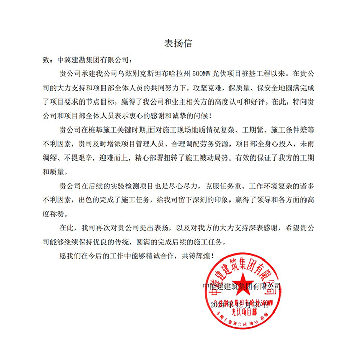 2024年12月20日,中能建建筑集團有限公司發(fā)來表揚信,對我公司施工的烏茲別克斯坦布哈拉州500MW光伏項目樁基工程及實驗檢測項目施工過程中,未雨綢繆,攻堅克難,合理調(diào)配人員和設備資源,克服了各種不利因素,保證了工程和質(zhì)量,出色的完成了施工任務,贏得了領(lǐng)導和項目參建單位的高度稱贊,給予了表揚,并表示愿今后的工作中能夠繼續(xù)精誠合作。