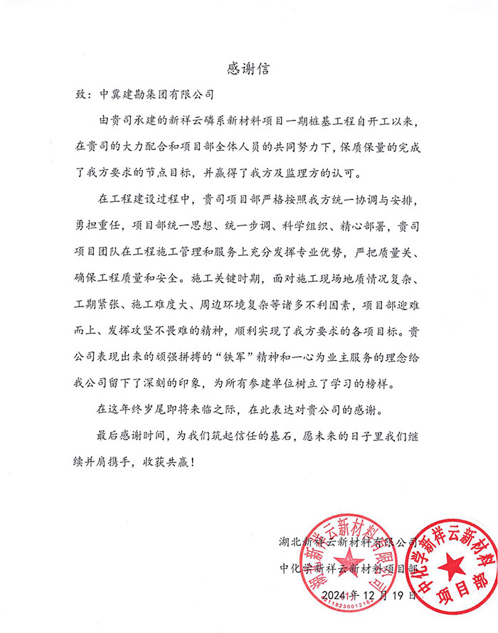 2024年12月19日,湖北新祥云新材料有限公司發(fā)來感謝信,對我公司正在施工的新祥云磷系新材料項目一期樁基工程在施工過程中,嚴格按照業(yè)主統(tǒng)一協(xié)調(diào)和安排,勇?lián)負?,面對地質(zhì)情況復雜、工期緊張、施工難度大等諸多不利因素,項目部迎難而上,發(fā)揮功堅克難的精神,順利完成了各項目標。對項目部表現(xiàn)出來的頑強拼搏的“鐵軍”精神和一心為業(yè)主服務的理念給予了表揚,特在年終歲尾之際發(fā)來感謝信。